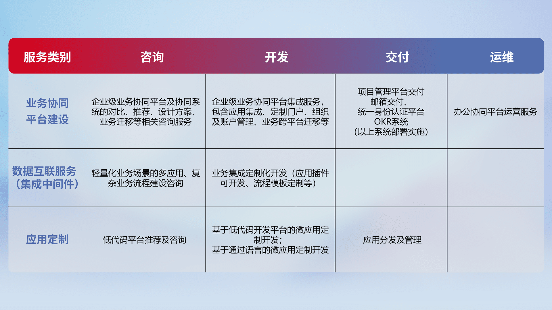 针对钉钉、、、企微、、、、IDaas等平台级产品提供产品的规划、、、、方案、、、、交付、、定制化开发等服务,,,,实现如统一协同办公、、智能客户服务、、混合会议管理、、、、智能数据查询、、、等业务场景,,实现数字化转型。。