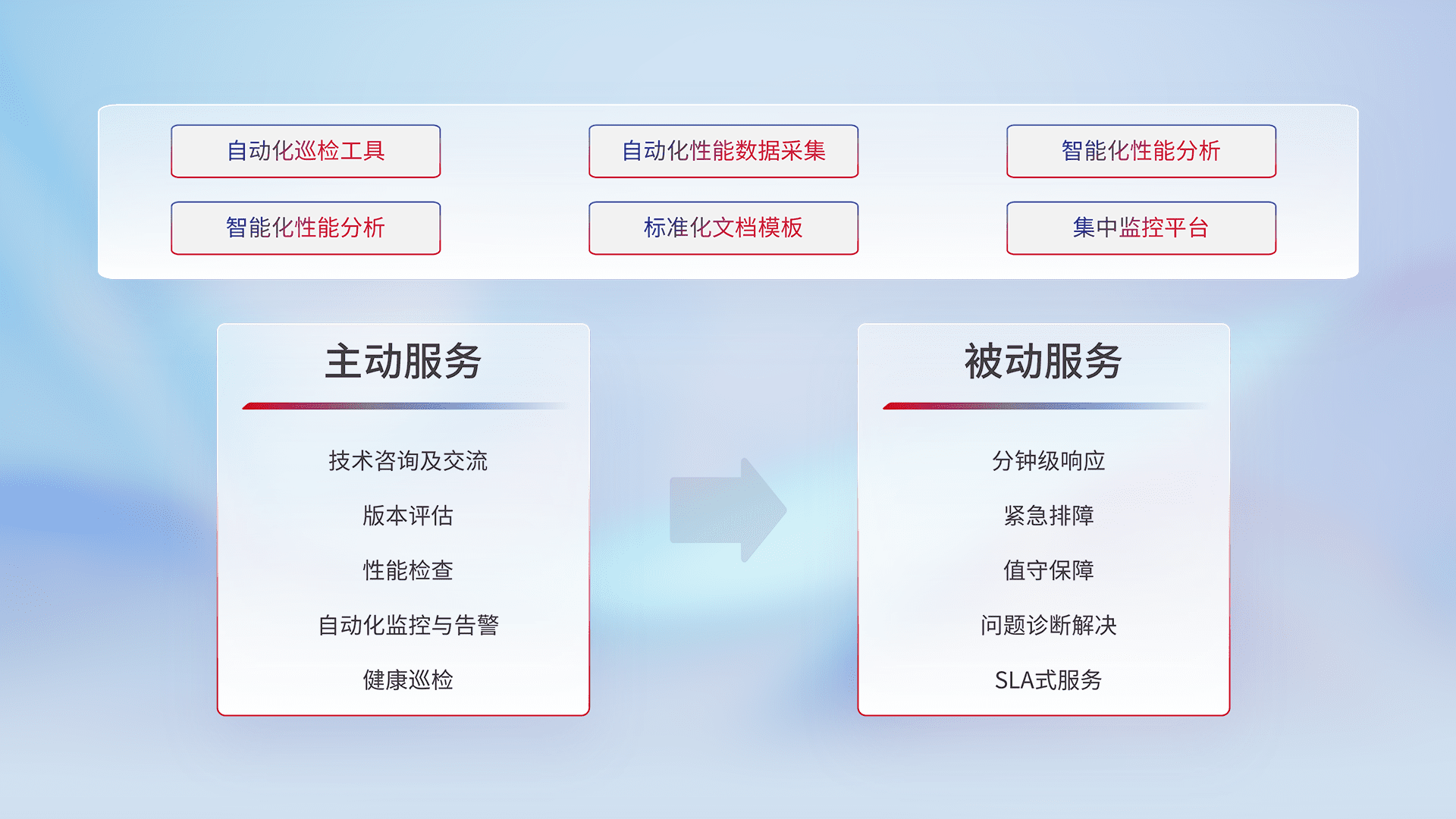 智能化工具和标准化文档,,保障服务质量,,提供主动服务(包含技术咨询、、、、版本评估、、性能检查、、自动化监控与告警、、、、健康巡检)和被动服务包含(分钟级响应、、紧急排障、、值守保障、、、问题诊断解决、、、、SLA服务)。。。。